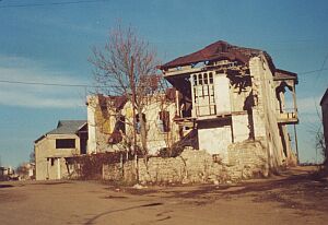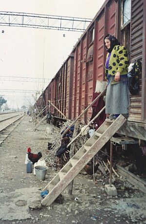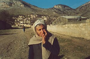 Жанна Галстян: Наш театр как бы хотел этим спектаклем вновь напомнить им, что - "не верьте данайцам, дары приносящим". Мумин Шакиров: Война сказывается на исполнении роли? Жанна Галстян: Безусловно. Мне кажется, что особенно в первоначальный период "Андромаха" поэтому именно не удалась. Там в один момент на сцене, когда я говорила с царем Менелаем, я почувствовала в его глазах настоящий испуг, не актерский. Пластика была совершенно другая, внутренняя и внешняя. В общем-то, не знаю, я это чувствовала. Мумин Шакиров: Если в самом Степанакерте почти не видно следов войны, то за его пределами о трагедии напоминает многое. Дорога "Степанакерт-Агдам" - это заброшенные мусульманские кладбища, разрушенные до основания армянские и азербайджанские села и минные поля с предупредительными табличками от организации Хэлотраст. Проводник, который сопровождал меня в поездке по пригороду Степанакерта, предупредил, что выходить на обочину опасно, так как были случаи подрыва людей на противопехотных минах. Азербайджанский Агдам издалека напоминает гигантскую свалку строительных материалов и бетонных конструкций. Местные власти неохотно туда пускают посторонних. Когда-то это был 70-тысячный город со знаменитым на весь Советский Союз коньячным заводом. За городом начинается линия противостояния. О том, как она выглядит, рассказывает Серж Саркисян. Серж Саркисян: Она собой представляет сплошную линию фронта, которая оборудована в инженерном отношении, по обе сторон которой находятся солдаты, считающие друг друга врагами, на протяжении всей границы, начиная с 60-ти метров, кончая до двух километров. Мумин Шакиров: Есть ли такое понятие - снайперская война? Серж Саркисян: Сейчас - нет. Думаю, что азербайджанцы поняли, что потери несем не только мы, они тоже несут потери. В любом случае бывает стрельба, но эта стрельба в основном бывает, когда на позицию приходит молодежь или когда кто-нибудь подойдет больше, чем это нужно. Мумин Шакиров: Проблема беженцев до сих пор не решена в Азербайджане. По данным властей, война вытеснила из родных мест около миллиона человек. Первые жертвы межэтнических конфликтов в Нагорном Карабахе и Армении нашли убежище в Сумгаите, в Баку и в других городах республики. Последними покидали свои дома жители Агдама, Физулей, Джабраила и Лачина. Теперь эти города контролируются карабахскими силами самообороны. Одним достались пустые товарные вагоны, другим общежития и административные здания, третьим - продуваемые в открытом поле пустыри. Азербайджанские власти пытаются облегчить жизнь людей, но этих забот им явно не хватает. Гуманитарная помощь из-за границы уже почти не поступает. Люди живут в глиняных мазанках, где маленькие дворики огорожены камышовыми заборами. Электричество поступает с перебоями, в комнатах сыро и отапливаются эти помещения только тогда, когда на примусах готовят еду. Многие беженцы покидали свои дома налегке. Кое-кому пришлось даже вплавь перебираться в соседний Иран через Аракс, оттуда их опять возвращали в Азербайджан, но в более безопасное место. В третьем лагере в Билясуарском районе, что находится в двухстах километрах от столицы Баку, много больных и постоянная нехватка лекарств и медикаментов. Рядом с такими городками появляются кладбища. Умирают люди от болезней и от антисанитарных условий и прос